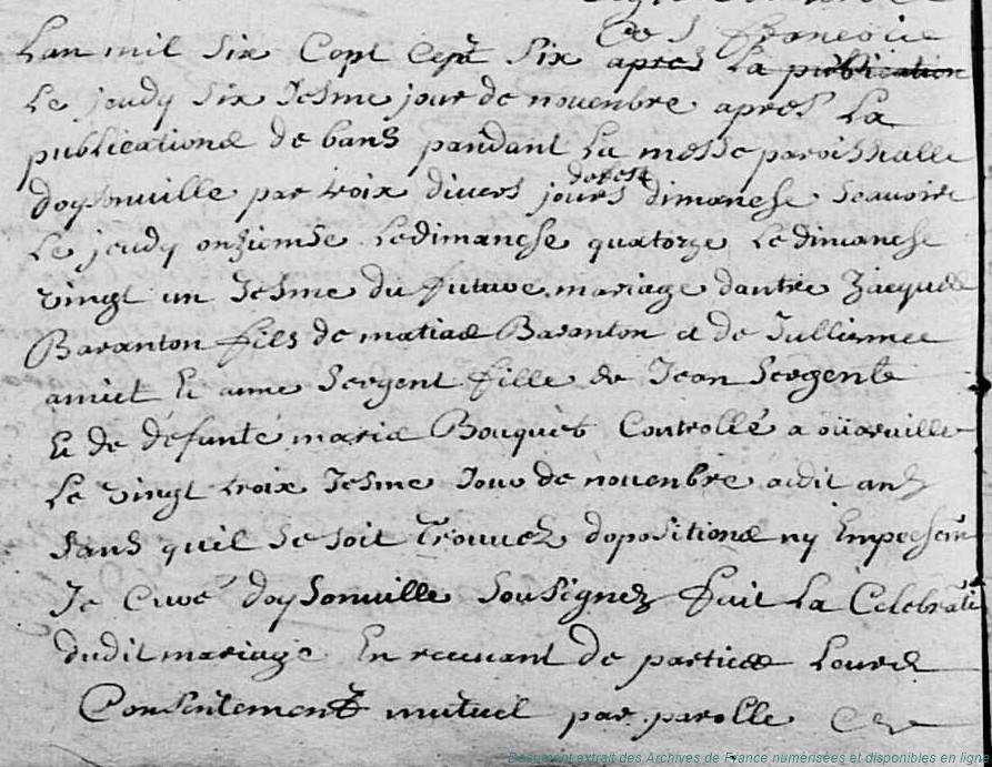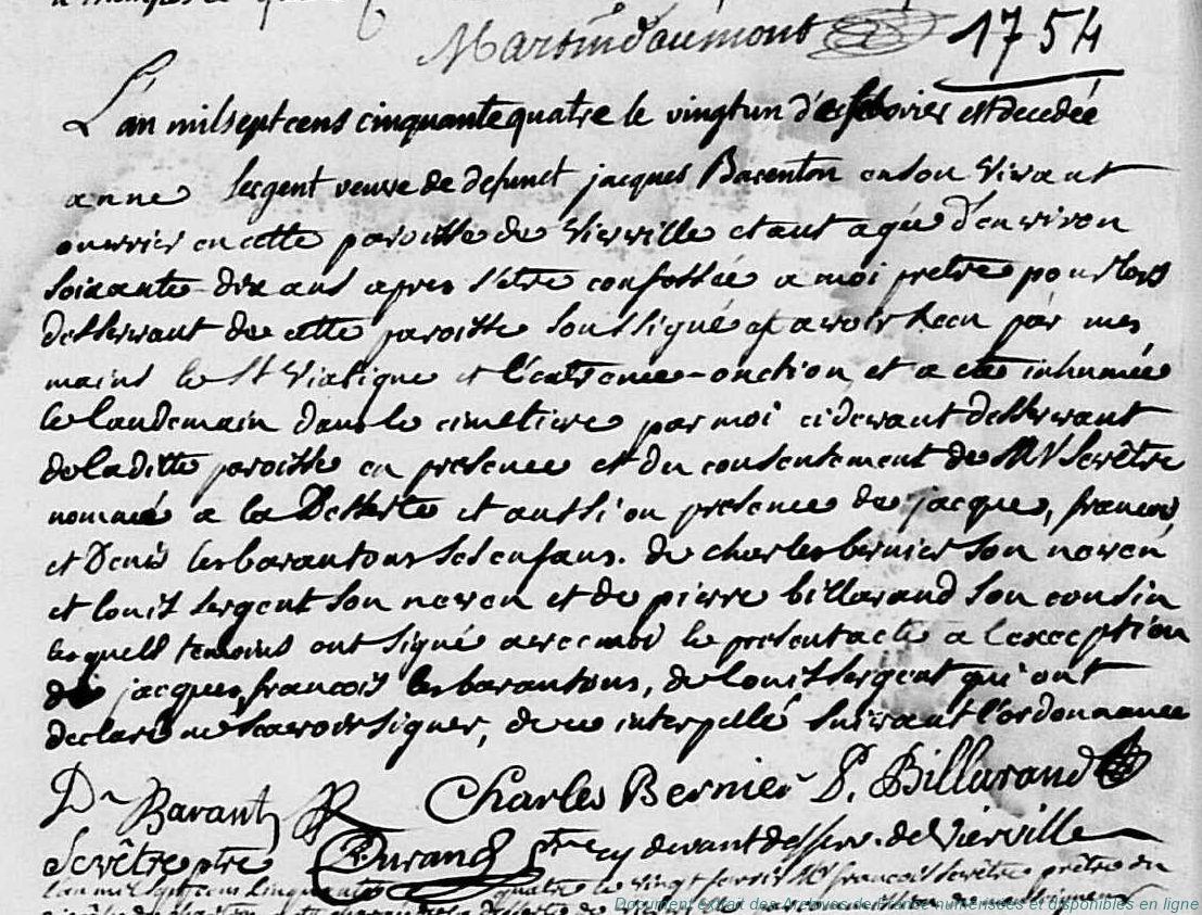 B - BARANTON Jacques (° vers 1672, + 16/12/1750 à Vierville - 28) - SERGENT Anne (° 7/02/1685 à Oysonville - 28, + 21/02/1754 à Vierville - 28) (x 6/11/1706 à Oysonville - 28)