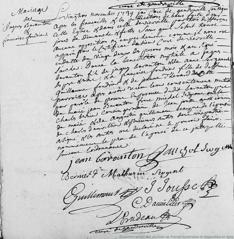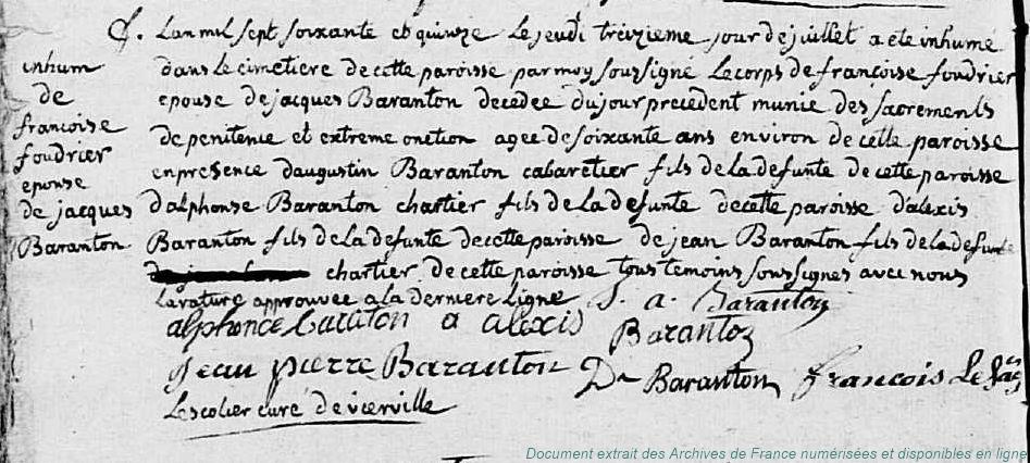 BA - BARANTON Jacques (° 23/01/1708 à Vierville - 28, + 6/06/1778 à Vierville - 28) - FOUDRIER Françoise (° 1715, + 12/07/1775 à Vierville - 28) (x 23/11/1739 à Grandville-Gaudreville - 28)