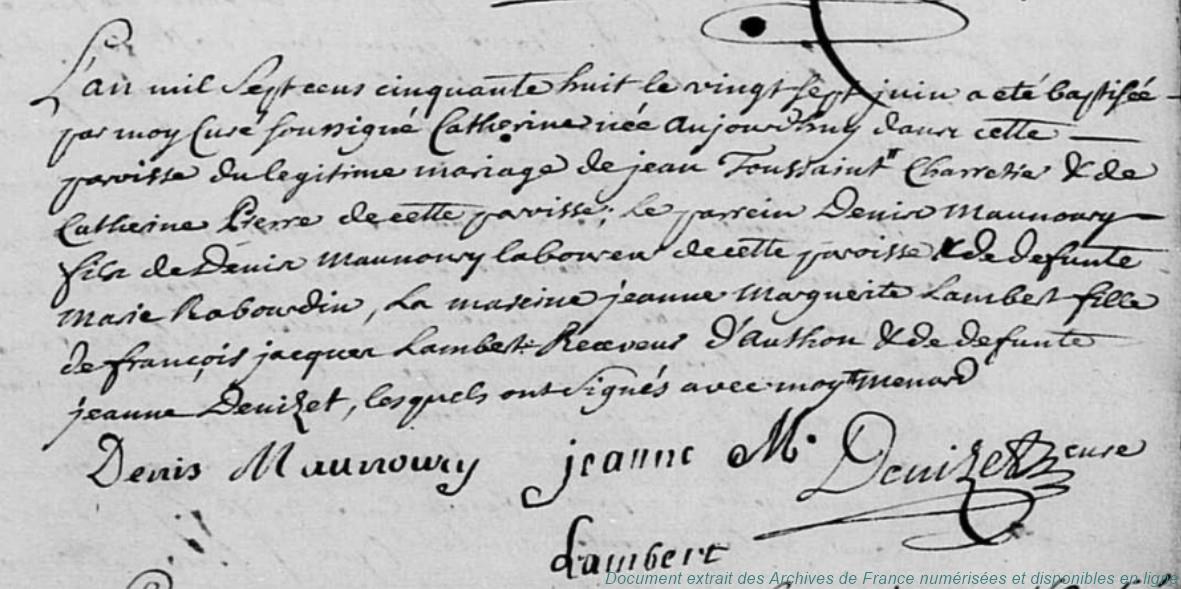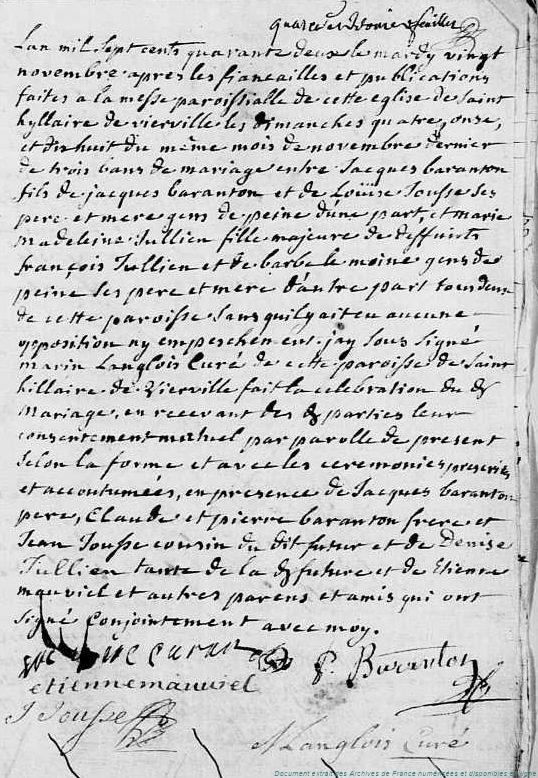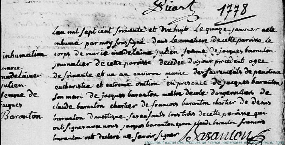 DE - BARANTON Jacques (° 22/06/1716 à Vierville - 28, + après 1778) - JULLIEN Marie Madeleine (+ 15/01/1778 à Vierville - 28) (x 20/11/1742 à Vierville - 28)