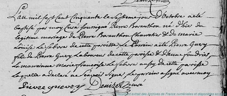 DG - BARANTON Pierre (° évalué à 1722) - LEFEVRE Marie-Louise (° 25/03/1723 à Vierville - 28, + 25/11/1770 à Vierville - 28) (x 27/01/1750 à Vierville - 28)