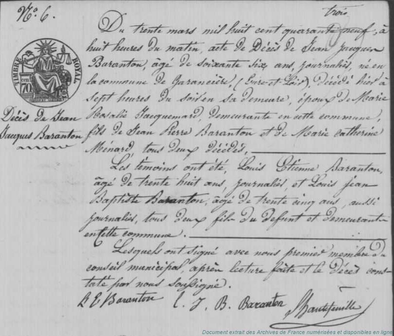 BAFD - BARANTON Jacques Frédéric (° 17/03/1792 à Garancières-en-Beauce - 28, + 21/07/1870 à Garancières-en-Beauce - 28) - CANET Marie Eugénie (° 8/03/1794 à Chalou-Moulineux - 91) (x 24/05/1819 à Chalou-Moulineux - 91)