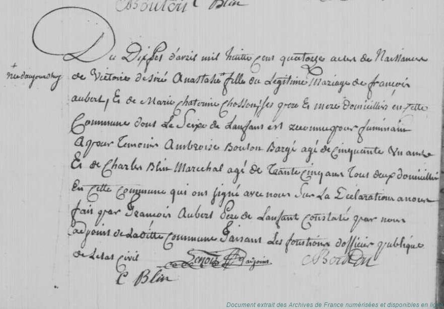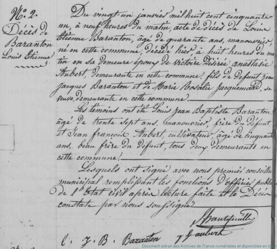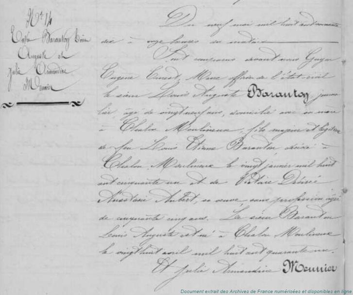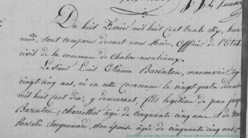 BAFAA - BARANTON Louis Etienne (° 23/12/1810 à Chalou-Moulineux - 91, + 20/01/1851 à Chalou-Moulineux - 91) - AUBERT Victoire Désirée Anastasie (° 17/04/1814 à Chalou-Moulineux - 91) (x 8/02/1836 à Chalou-Moulineux - 91)