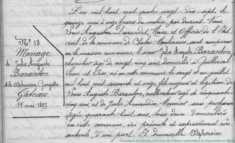 BAFAABA - BARANTON Jules Auguste (° 21/07/1871 à Chalou-Moulineux - 91, + 1/05/1953 à Chalou-Moulineux - 91) - GATEAU Alphonsine Georgette (° 20/04/1871 à Chalou-Moulineux - 91, + 2/01/1934 à Chalou-Moulineux - 91) (x 15/05/1897 à Chalou-Moulineux - 91)