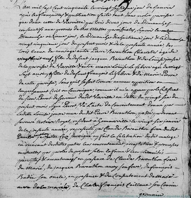 DG - BARANTON Pierre (° évalué à 1722) - LEFEVRE Marie-Louise (° 25/03/1723 à Vierville - 28, + 25/11/1770 à Vierville - 28) (x 27/01/1750 à Vierville - 28)